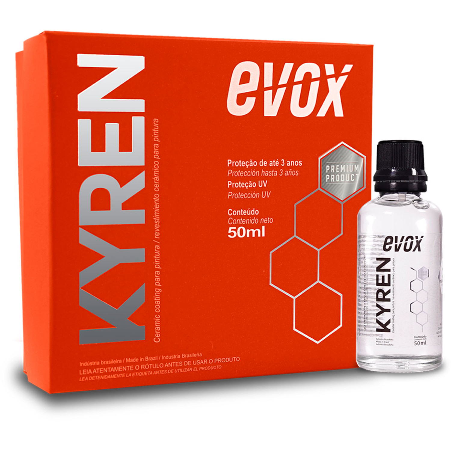 KYREN da Evox é um coating cerâmico para pintura com durabilidade de até 3 anos, desenvolvido com silício que forma na pintura uma proteção nanotecnológica que promove hidrorrepelência, proteção UV e brilho profundo. O produto minimiza efeitos nocivos de seivas de árvores, excrementos de pássaros, maresia, chuva ácida, microrriscos causados por lavagens mal executadas, evitando o desgaste precoce da pintura.