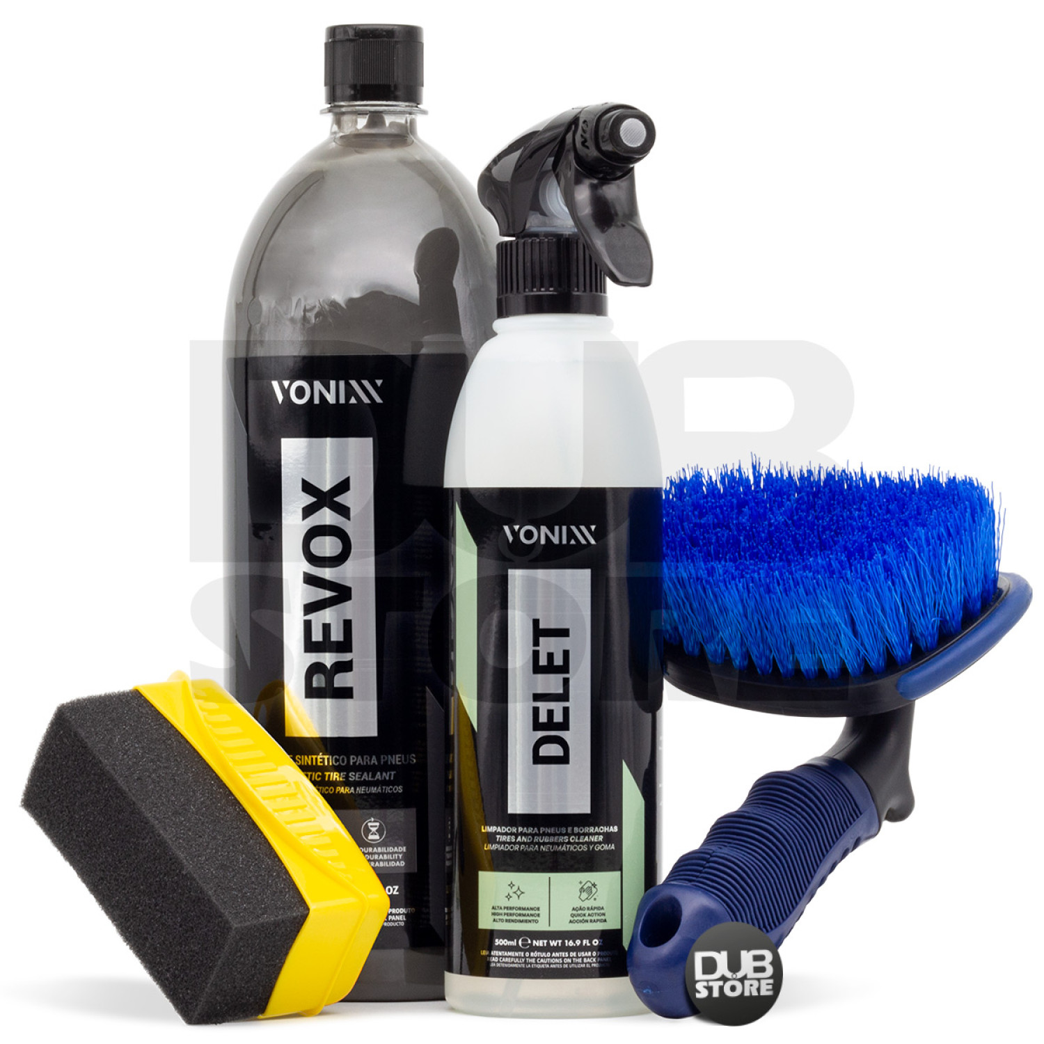 O primeiro produto do kit é o Delet da Vonixx, um limpador de alta performance especialmente formulado para remover sujidades severas em pneus e borrachas. Sua fórmula exclusiva garante uma limpeza profunda, devolvendo a originalidade aos pneus sem deixar nenhum aspecto acinzentado indesejado. Com o Delet, você pode contar com uma limpeza eficiente que ajuda a melhorar a performance dos produtos de condicionamento de pneus, como o Revox.