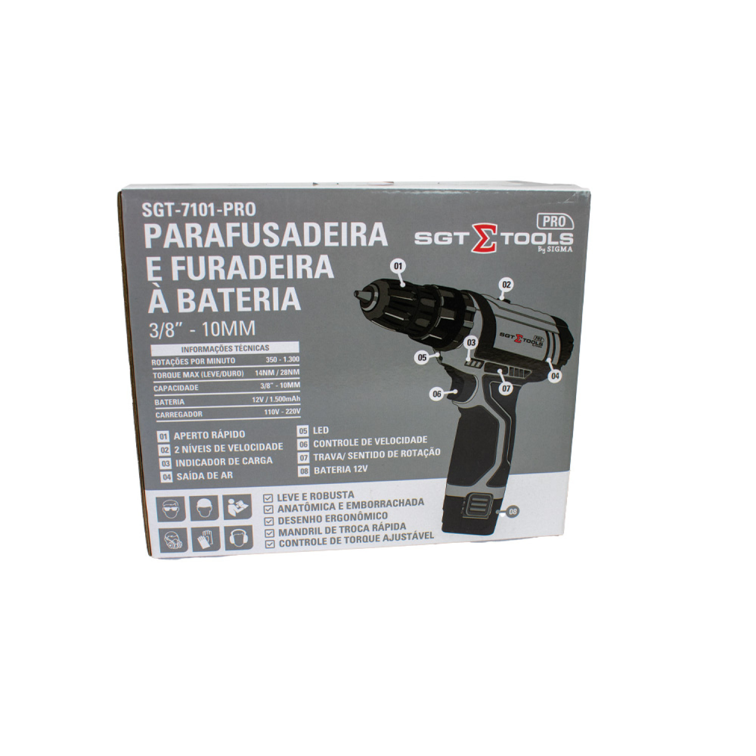 | Itens inclusos | 1 x Parafusadeira e Furadeira à Bateria Sigma Tools SGT-7101-PRO 1 x Bateria 12v 1500mAh 1 x Carregador de Toamada |